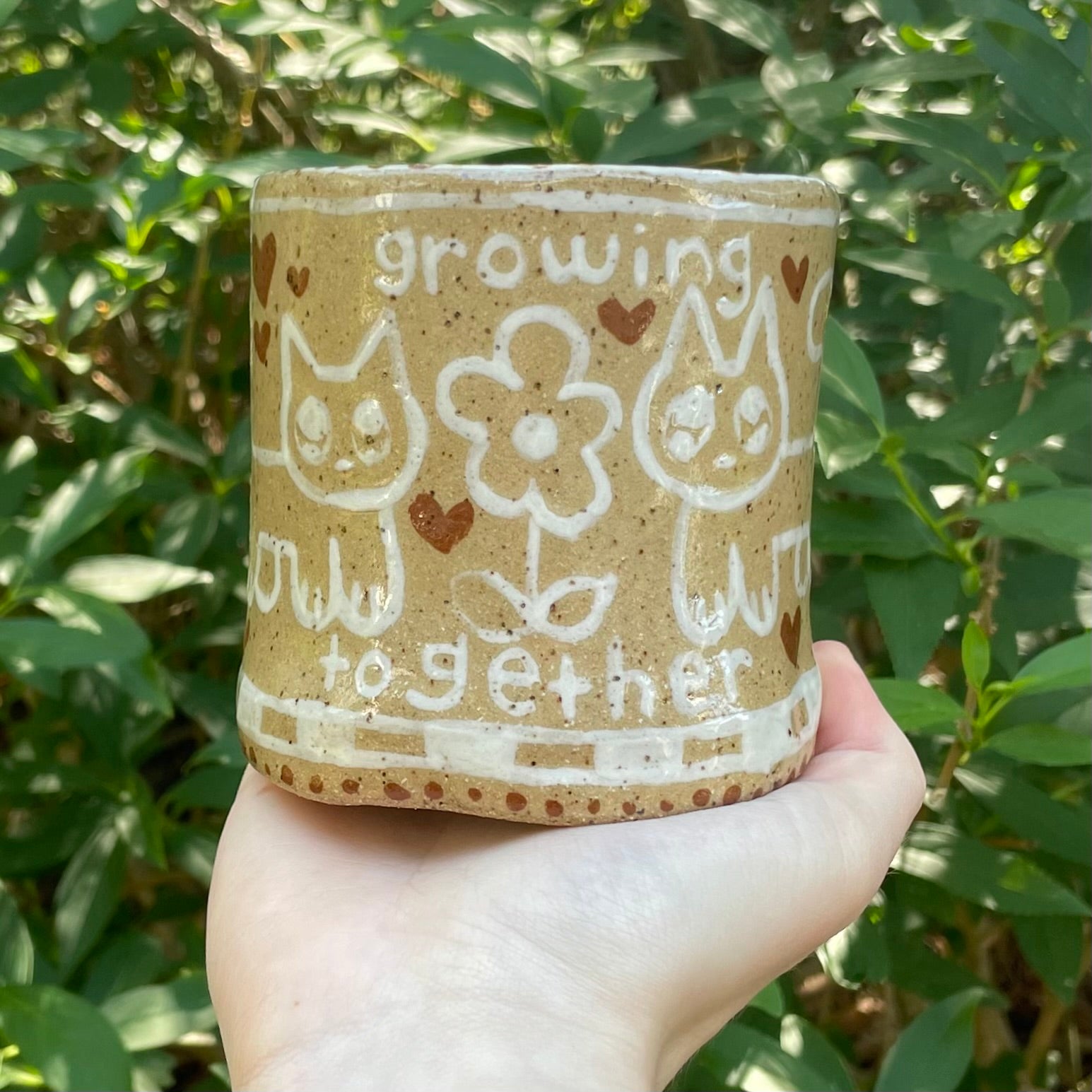 "growing together" kitty cats tan & white ceramic stoneware flower pot!