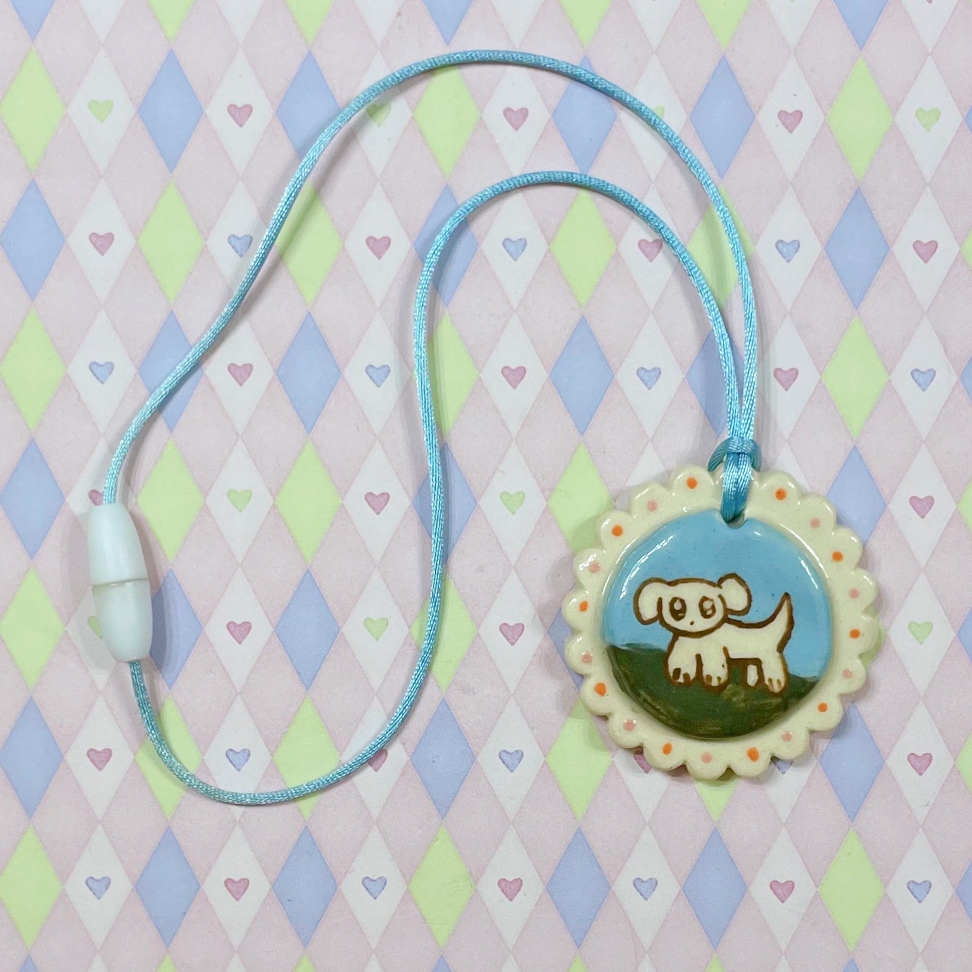 blue & white puppy dog kawaii ceramic stoneware necklace!