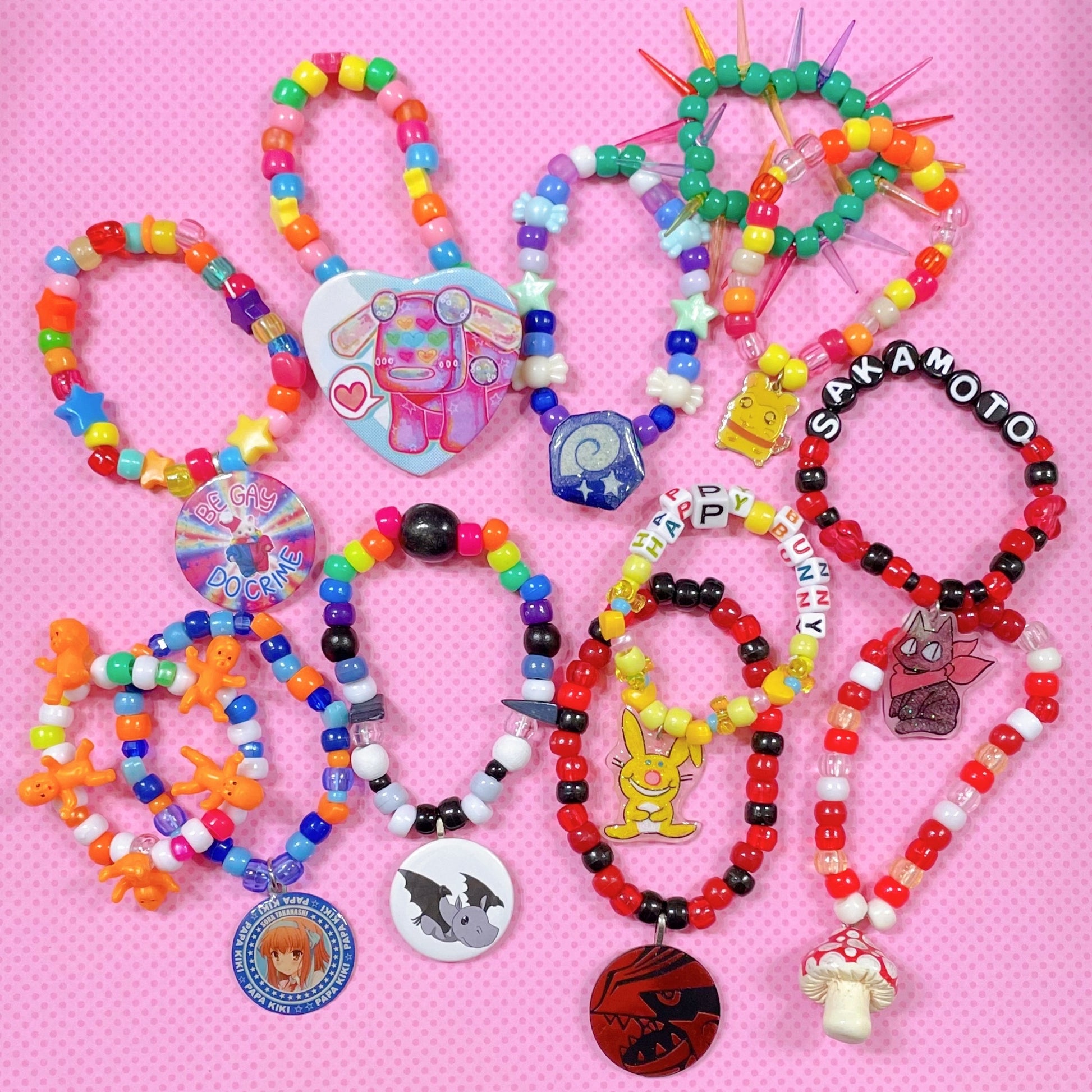 secondhand toys and handmade charms repurposed on 8" beaded elastic cords.