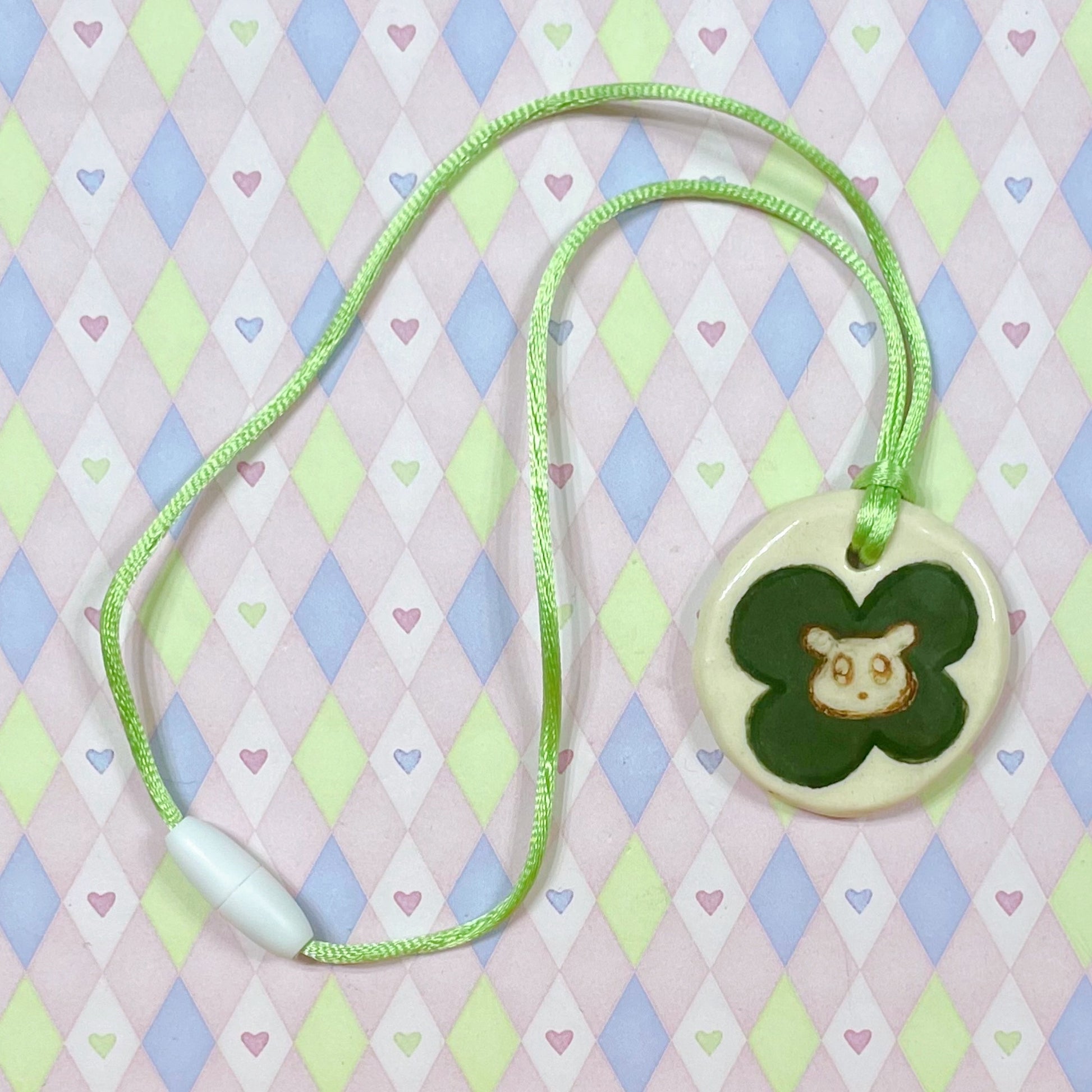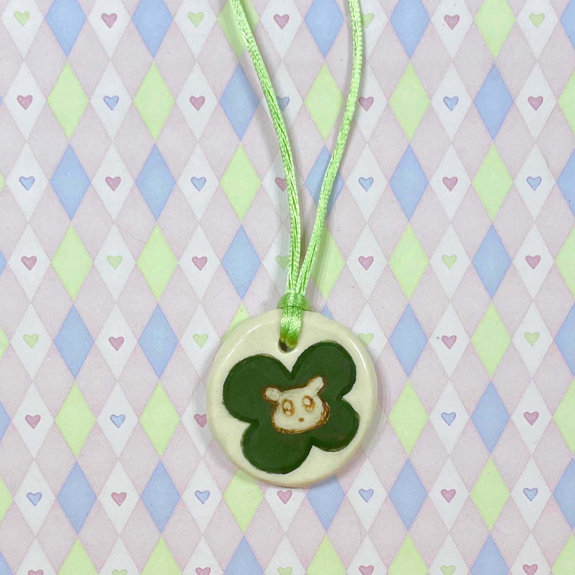 white & green cloverdog kawaii ceramic stoneware pendant necklace!