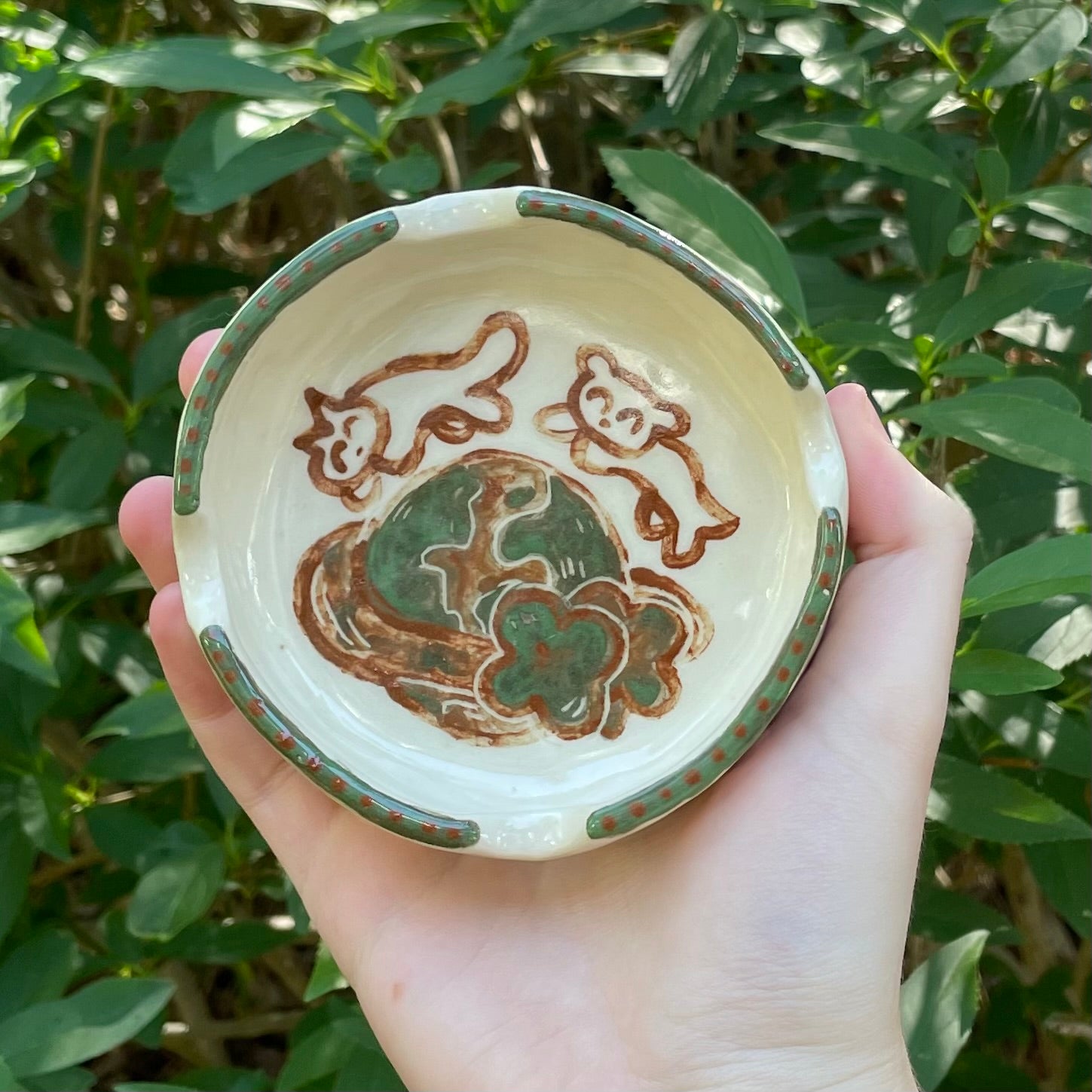 kitty puppy clover globe white brown green kawaii stoneware ceramic ashtray!