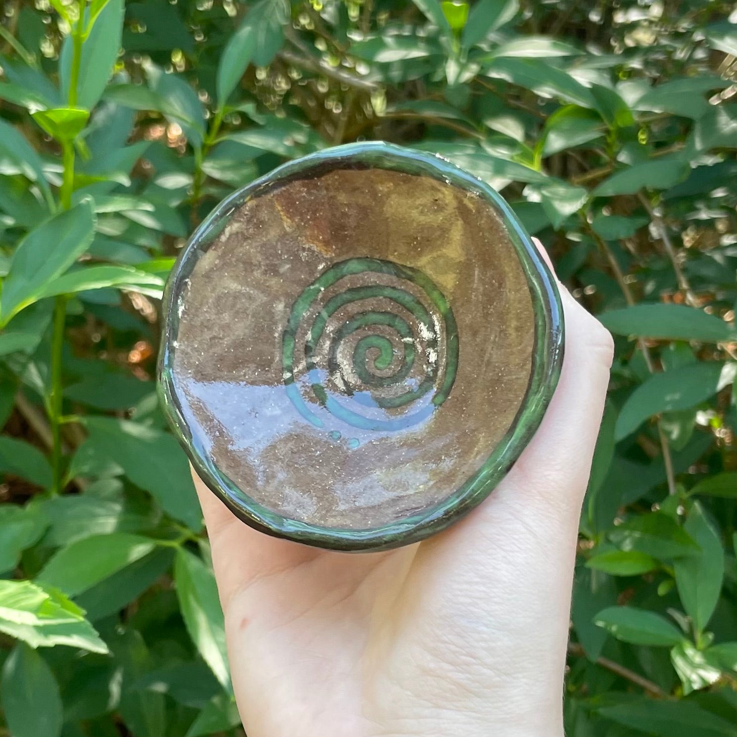 green & brown spiral swirl handmade small ceramic stoneware dish!