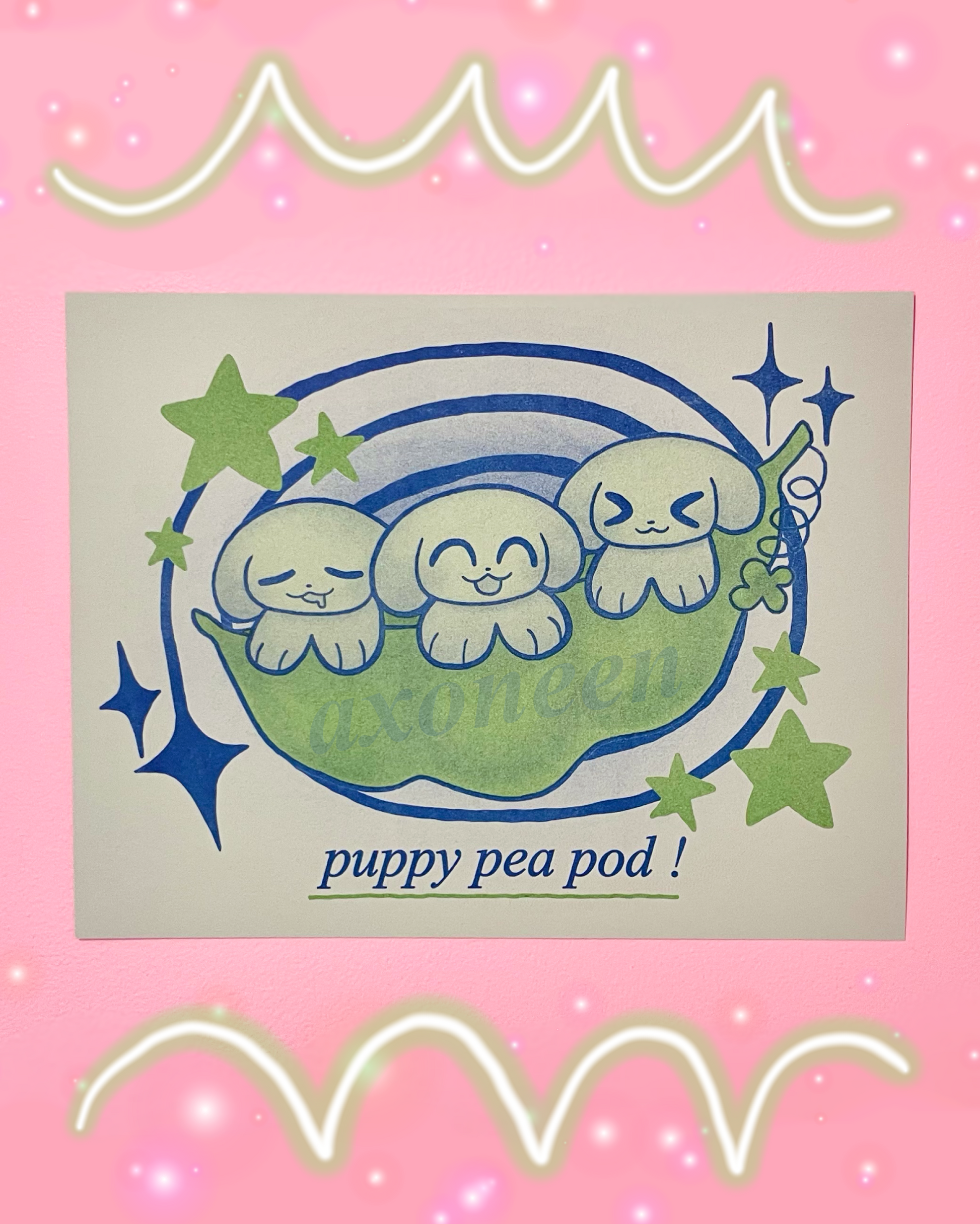 puppy pea pod funny kawaii puppy dog green blue risograph print! (8.5" x 11")