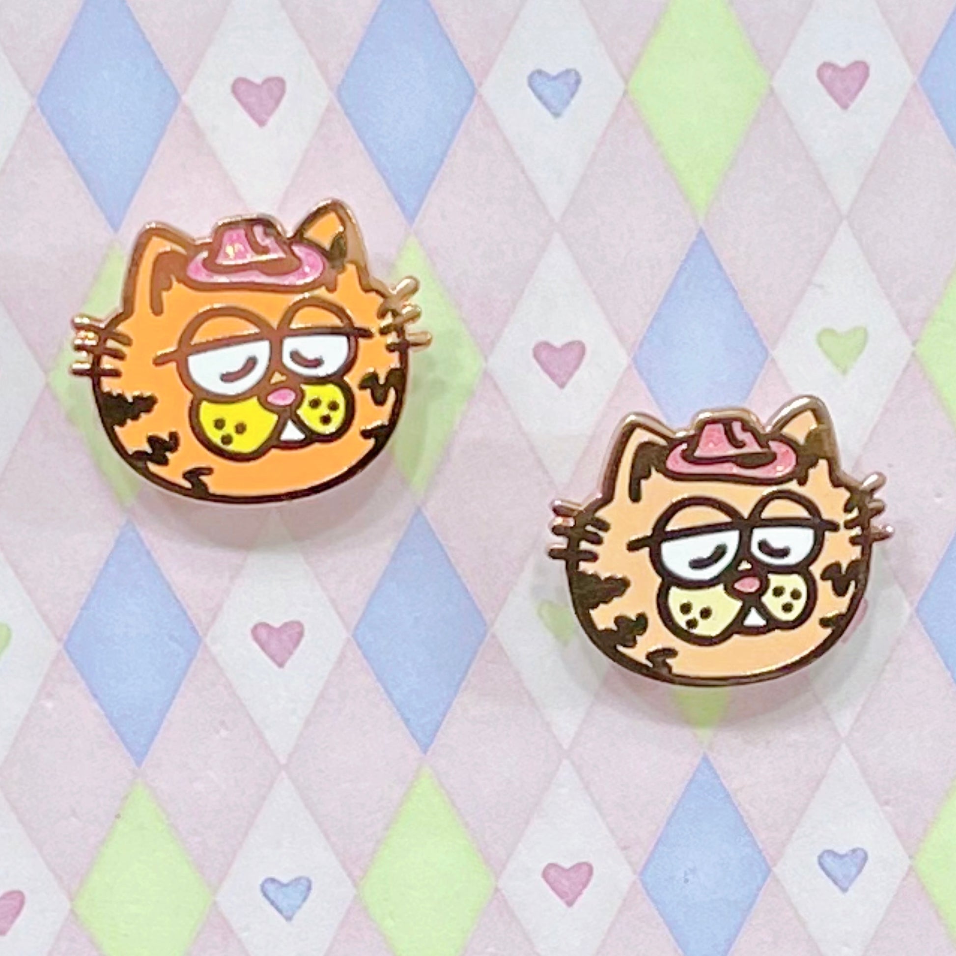 everyone's favorite orange cat, shrunk down into a 1" wide, hard enamel pin with copper plating and a glittery cowboy hat ^__^)/