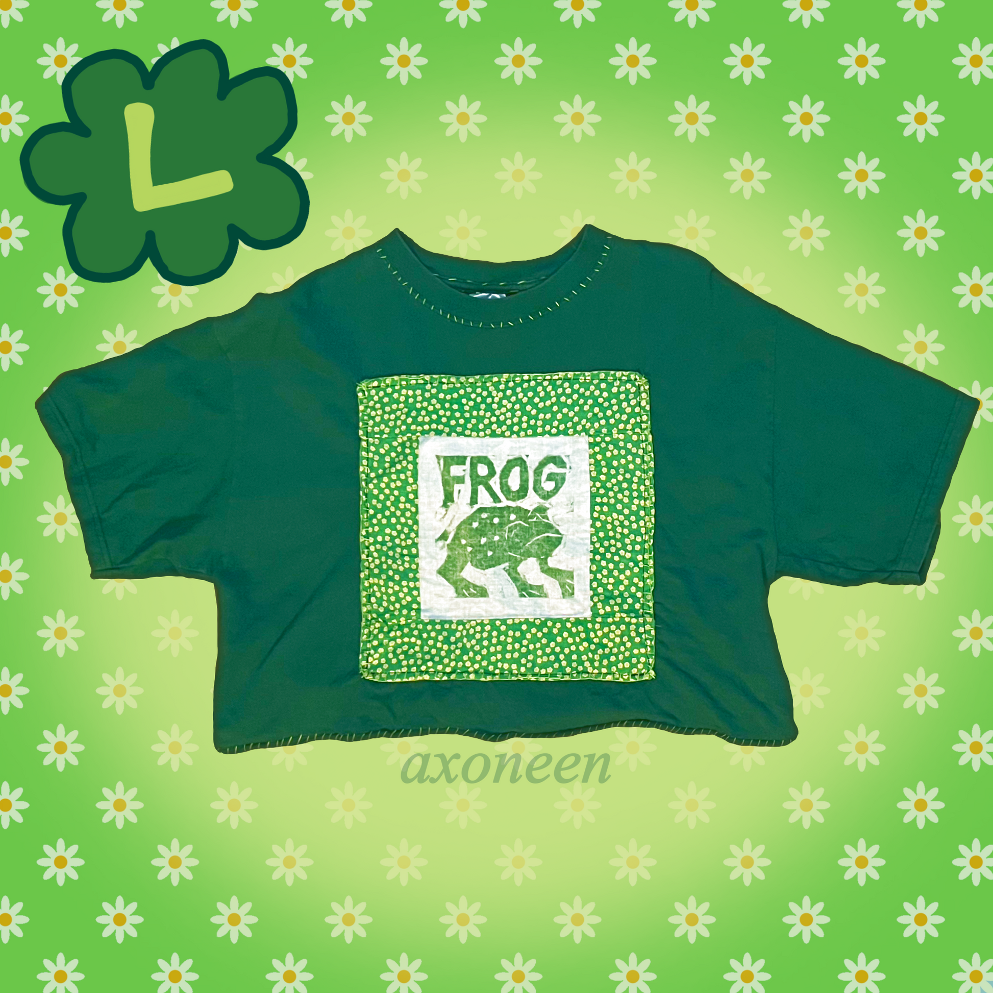 green frog block print sewn upcycled cropped t-shirt! (large)