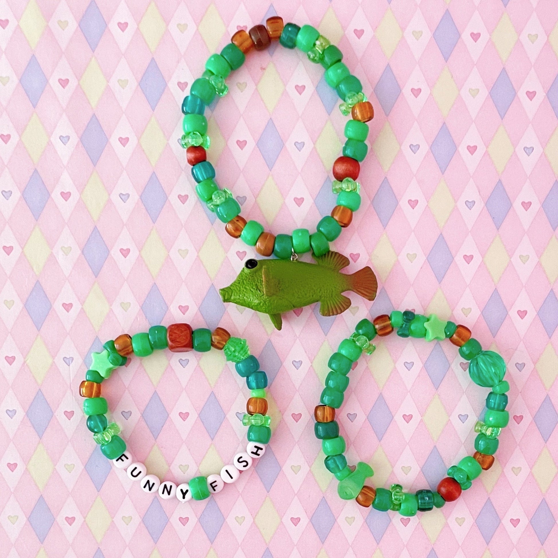 secondhand fish toy repurposed on a 8" beaded elastic cord. one of a kind!!