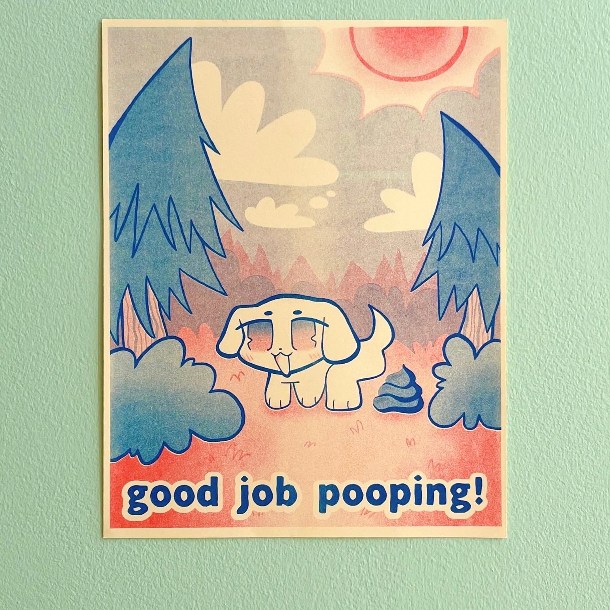 good job pooping funny kawaii puppy dog yellow red blue risograph print! (8.5" x 11")