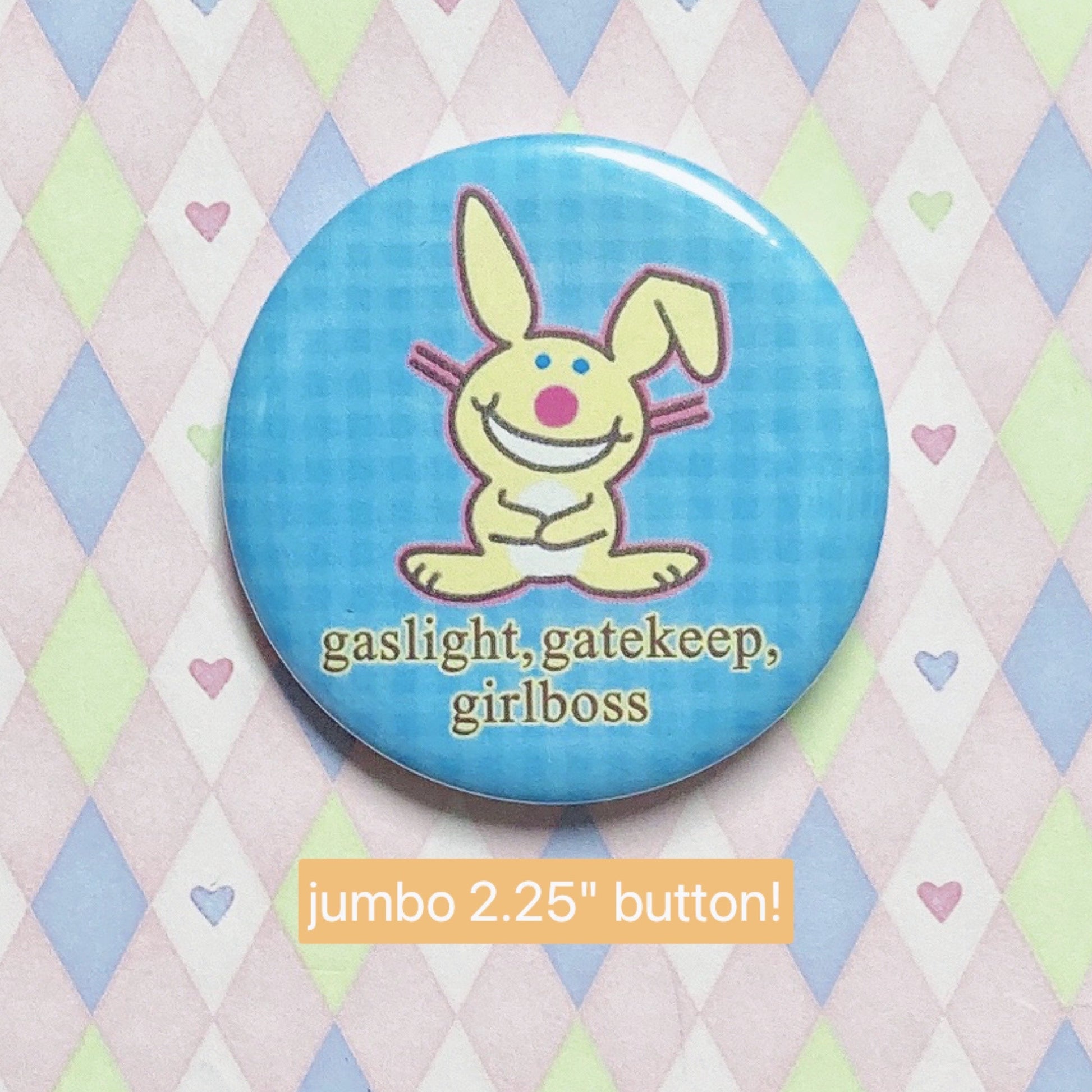 cheerful rabbit 'gaslight, gatekeep, girlboss' jumbo button! (2.25")
