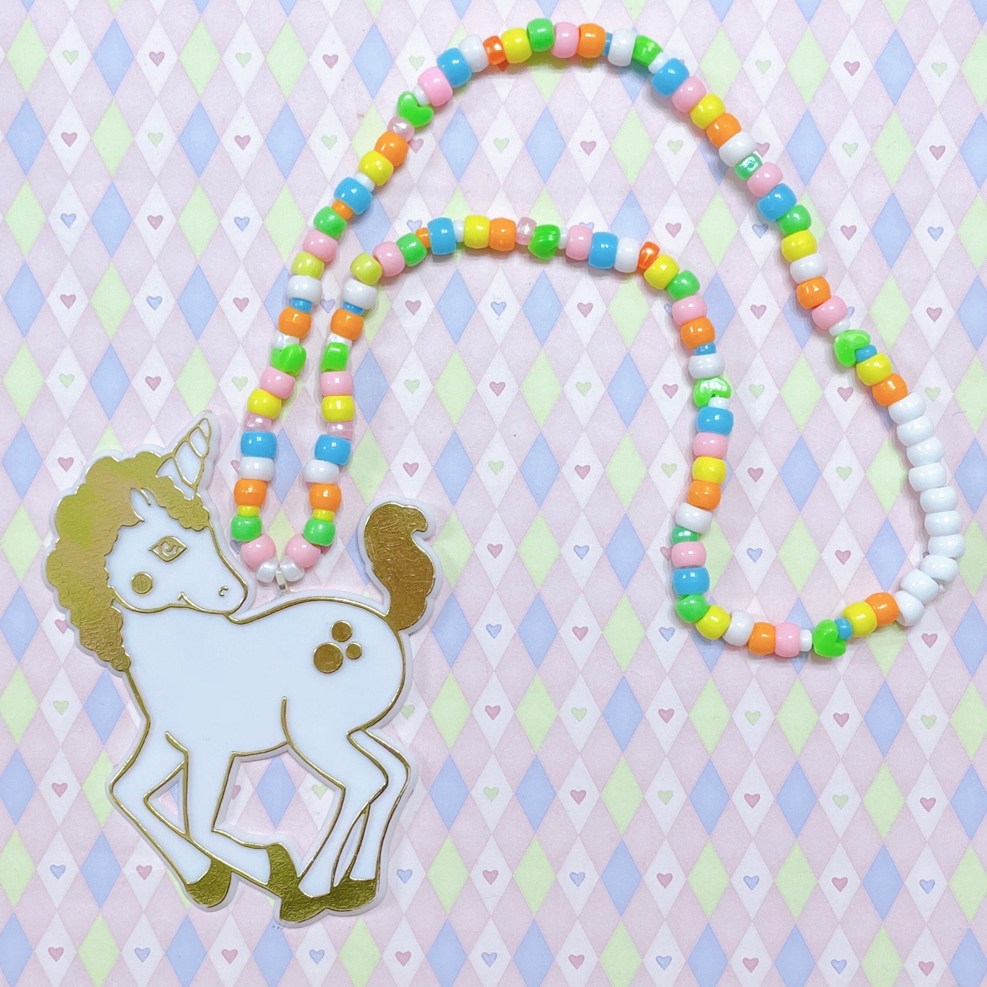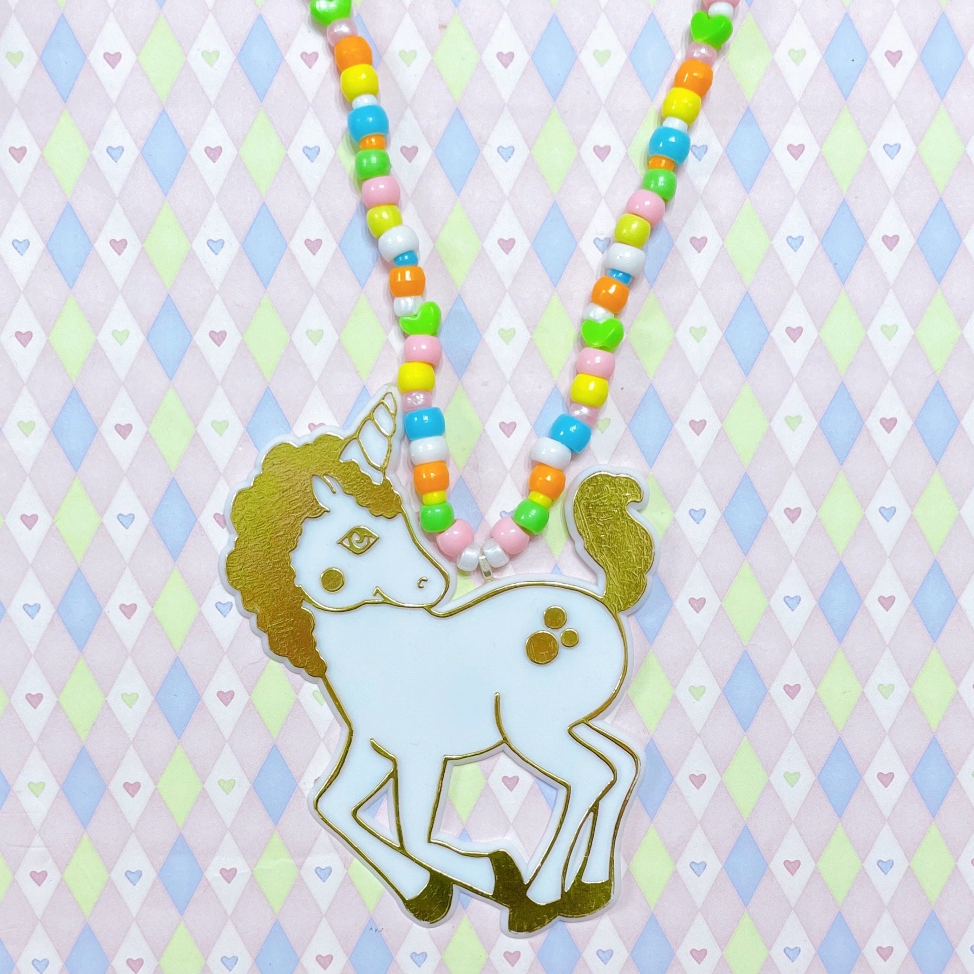 jumbo white gold unicorn rainbow y2k nostalgic kawaii cute decora toy kidcore chunky kandi beaded necklace!