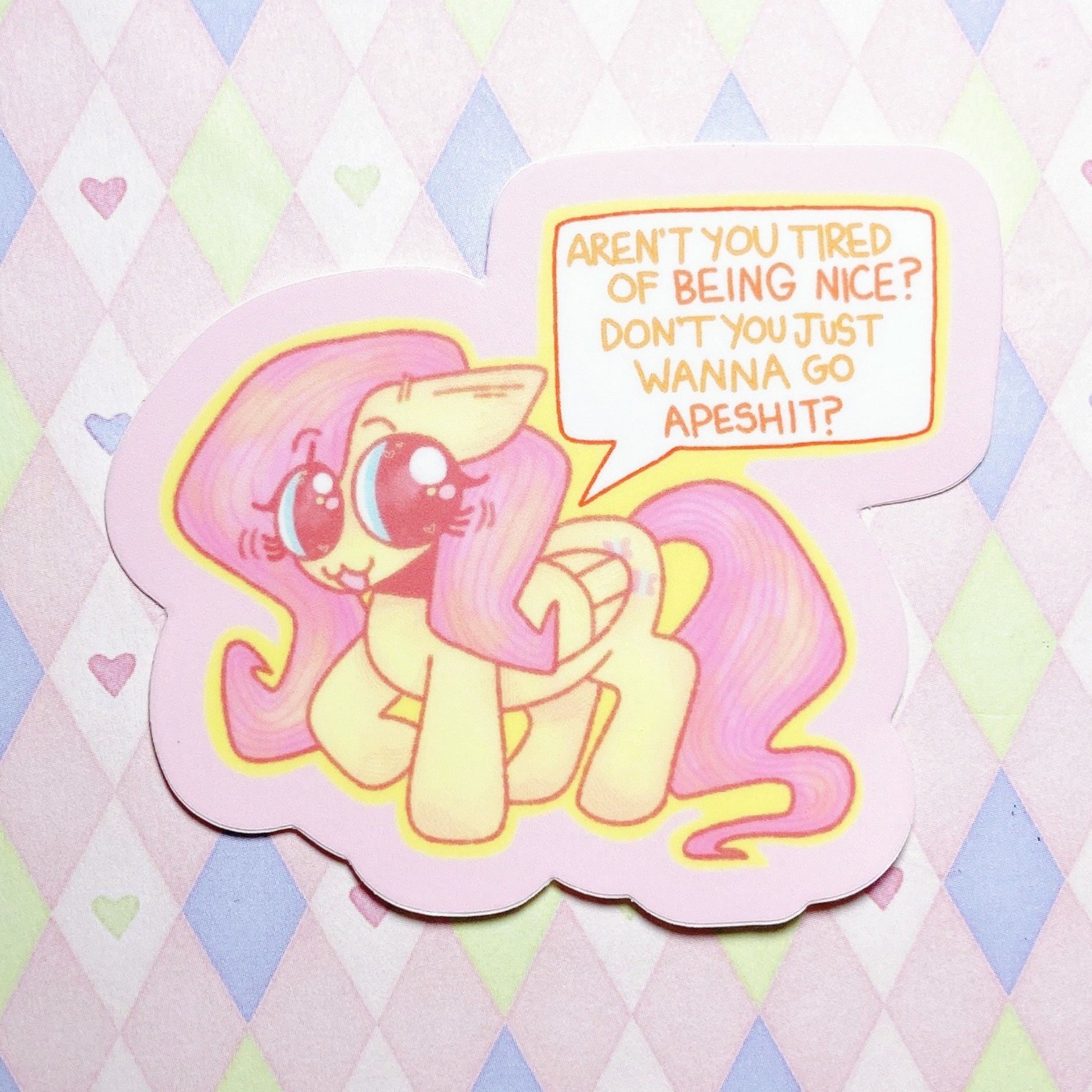 my little pony fluttershy 'aren't you tired of being nice? don't you just wanna go apeshit?' sticker! (3")