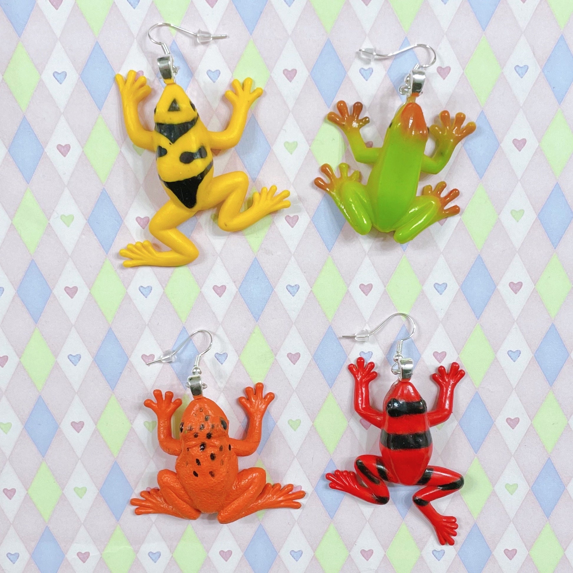 multicolor poison dart frog kidcore upcycled plastic toy dangle earrings!