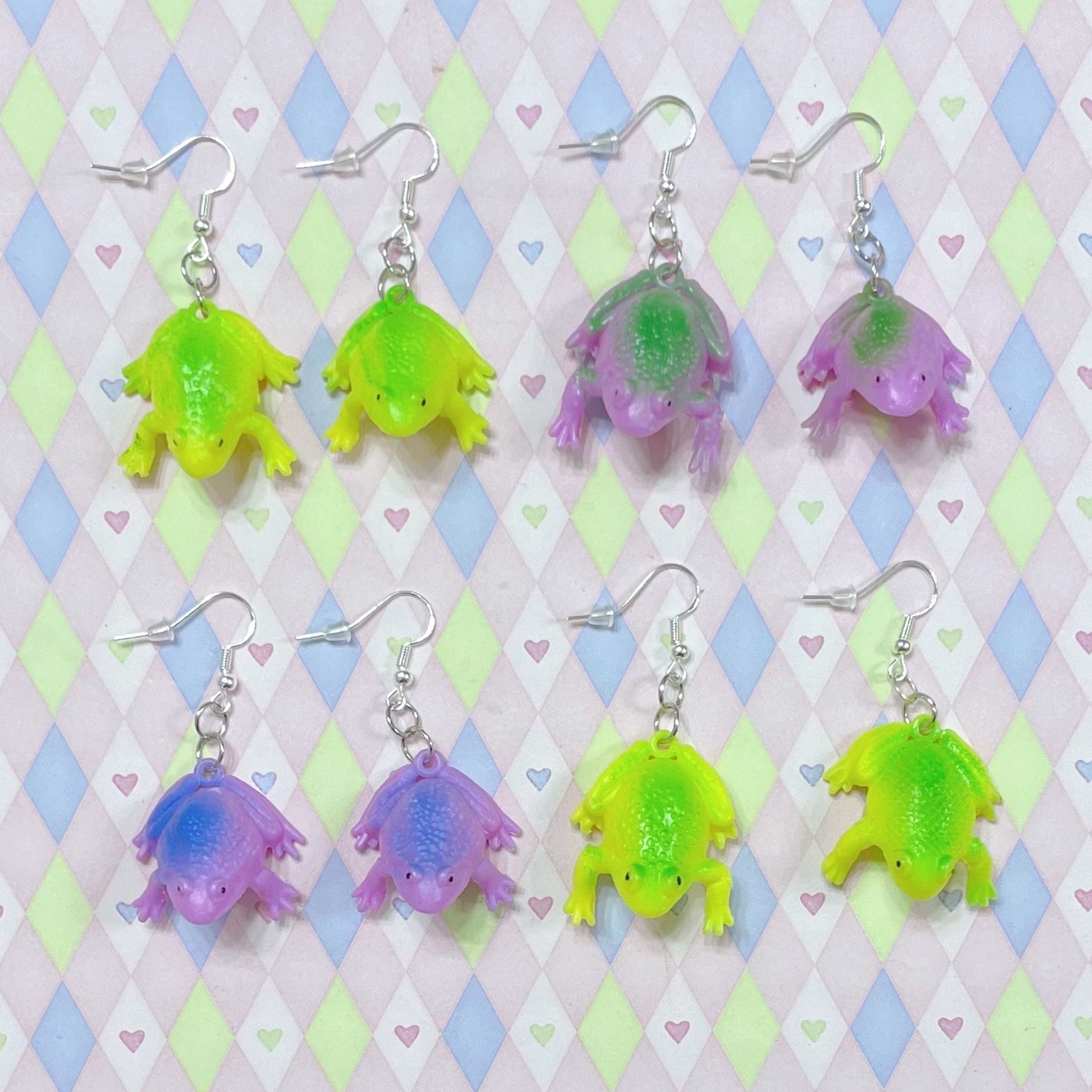 neon purple yellow green mini frog kidcore upcycled plastic toy dangle earrings!