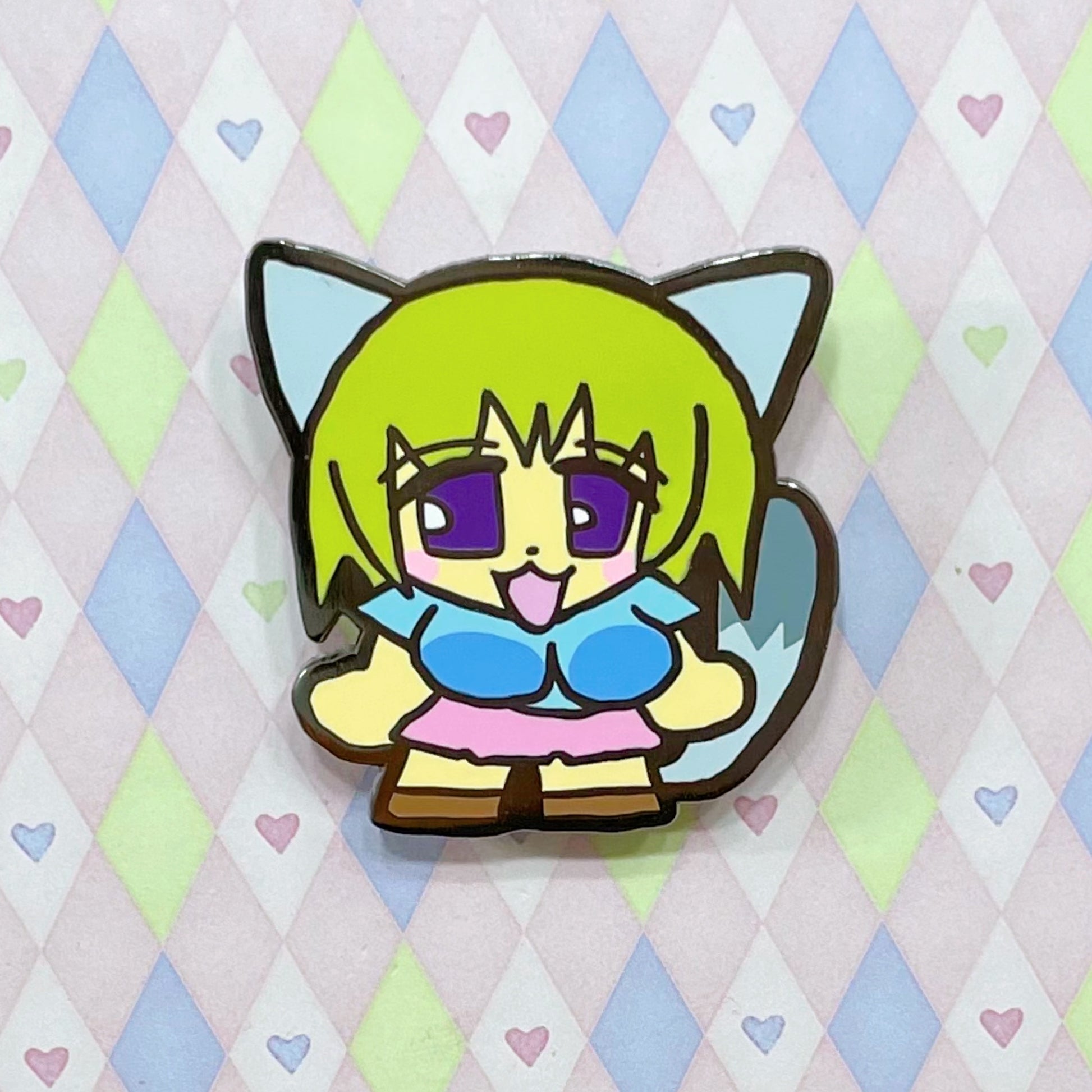 everyone's favorite rabid girl shrunk down into a 2" tall, hard enamel pin with silver plating and silk print details ^w^)/
