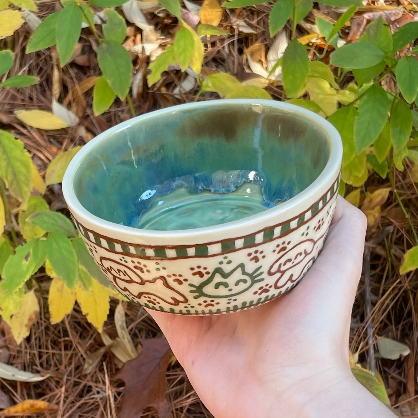 green brown puppy kitty wheel thrown ceramic stoneware dish!