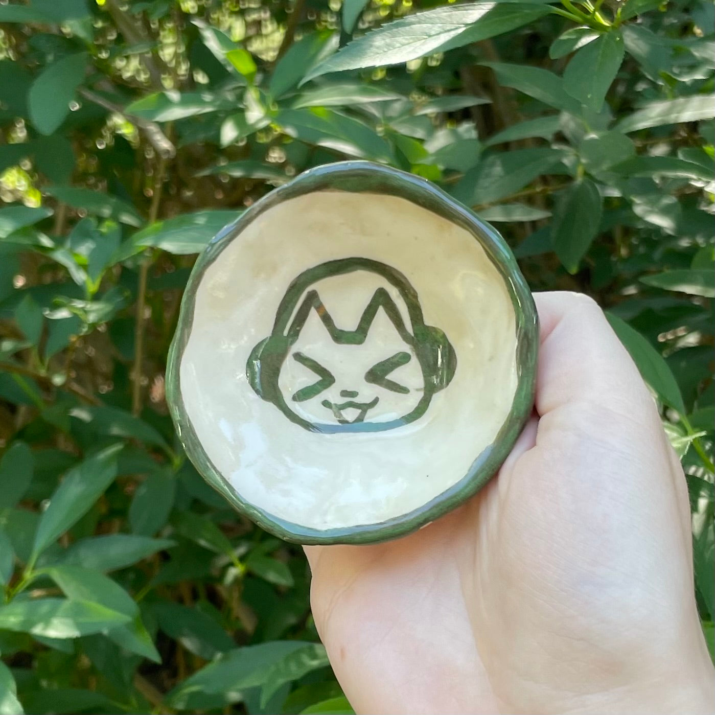 green & white headphone kitty cat handmade small ceramic stoneware dish!
