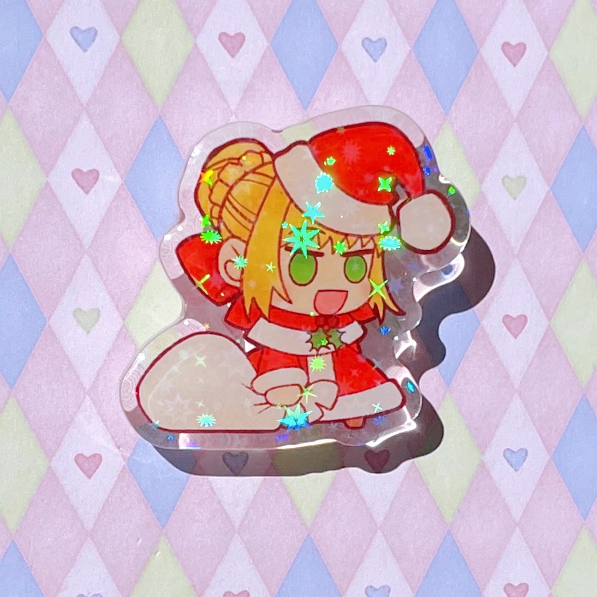 type moon fate padoru holiday saber anime meme holographic glitter acrylic pin! (2")